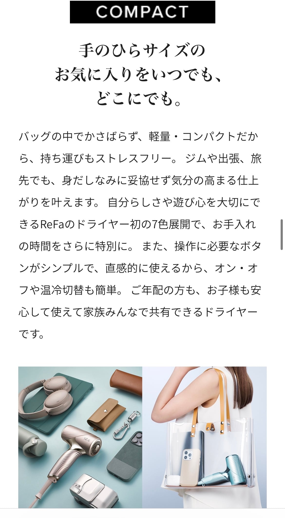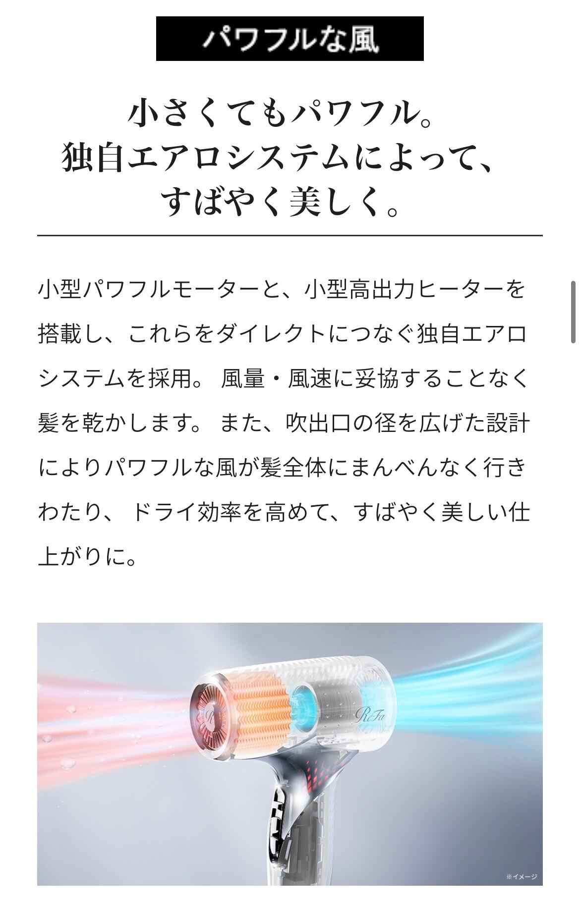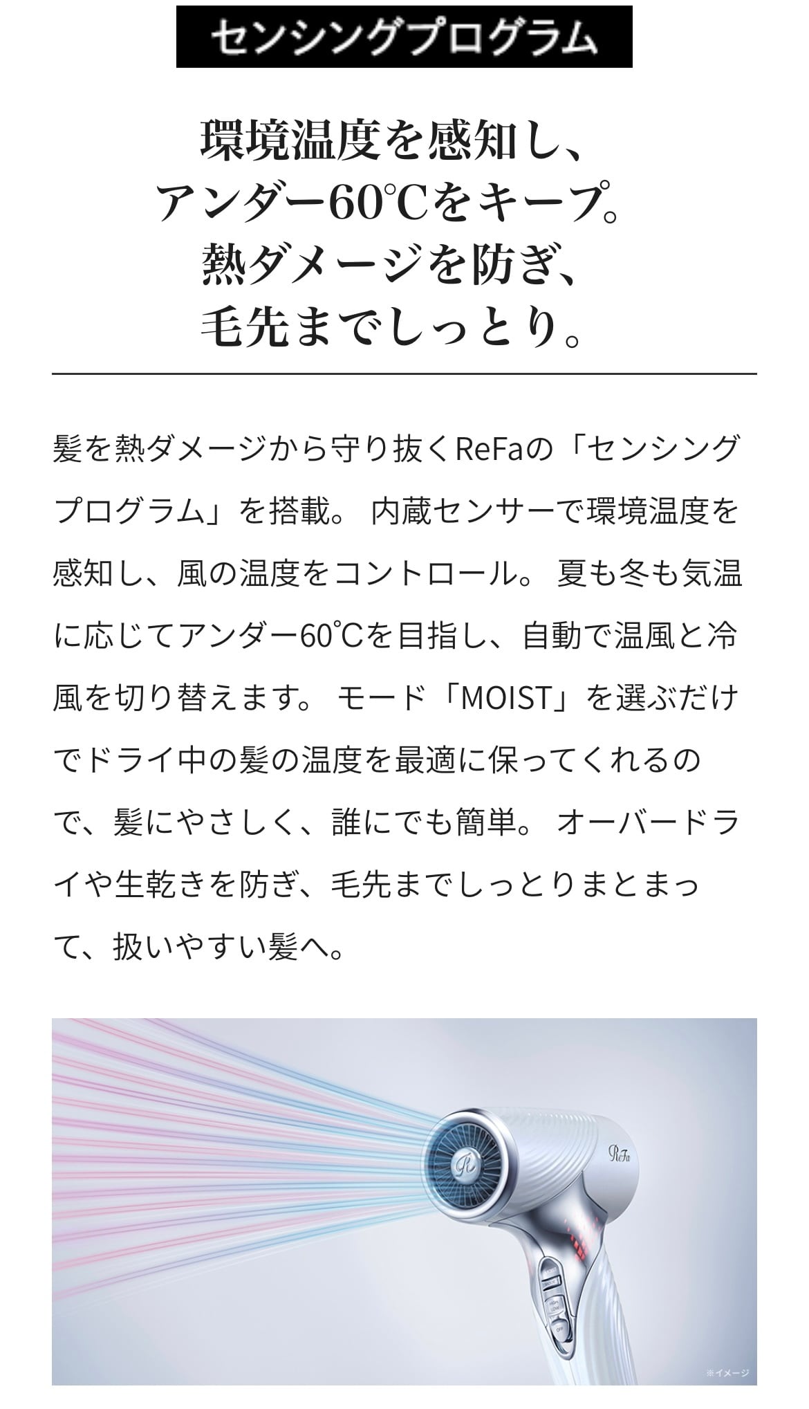 熱を自動コントロールするセンシングプログラムやReFa独自の融合技術ハイドロイオンによって、乾かすだけで理想の髪になれる手のひらサイズの頼れるドライヤーです。